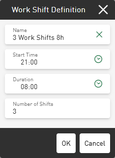 Enter a Name for the work shift definition, as well as Start Time, Duration and the Number of Shifts.