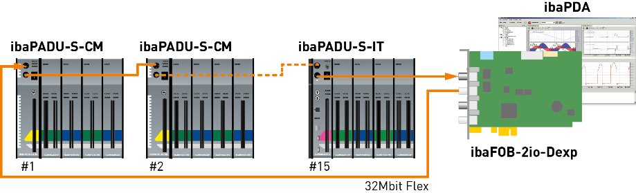 ibaPADU-S-IT oder ibaPADU-S-CM mit ibaMS-Baugruppen, ibaBM-DDCS, ibaBM-SiLink, ibaBM-eCAT, ibaBM‑DP, ibaBM-PN, ibaPADU-D-8AI-U/-8AI-I (bis zu 15 Geräte können in einem Ring kaskadiert werden), ibaPADU-4-AI-U, etc. |