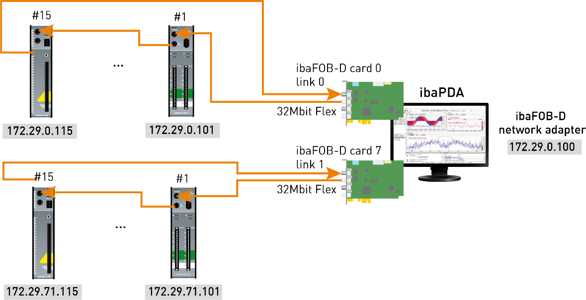 The Flex devices in the ibaFOB-D network are identified via IP addresses. The ibaFOB-D network adapter has the following IP address by default: 172.29.0.100 and the subnet mask 255.255.0.0.