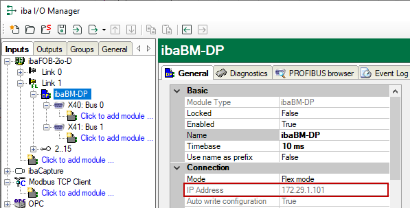 If the first two digits of the IP address of the ibaFOB-D network adapter are changed in an existing configuration, the ibaPDA configuration of all connected Flex devices must be applied again (click on <OK> or <Apply>) so that the first two digits of the IP address of the device are adjusted. Otherwise communication will be interrupted.