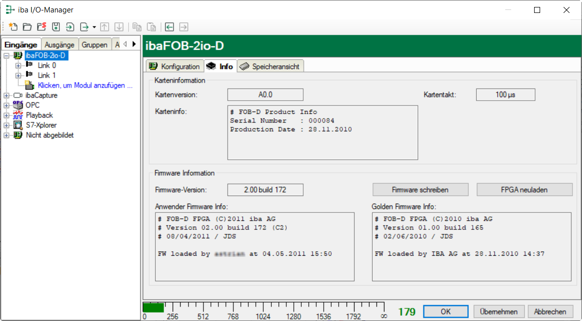 Informationen über die Karte und die geladene Firmware erhalten Sie im Register Info. Funktionen für Service und Support, wie z. B. das Neuladen des FPGA und Aktualisieren der Firmware, sind ebenfalls integriert.
