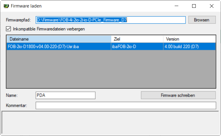 Die Firmware-Dateien, die sich im Verzeichnis befinden, werden in einer Tabelle aufgelistet. Angegeben werden der Dateiname, die zugehörige Karte und die Firmware-Version. Die Dateien können Anwender-Firmware oder die werksseitige "Golden"-Firmware oder beide enthalten. Die "Golden" Firmware wird nur bei der Herstellung geladen.