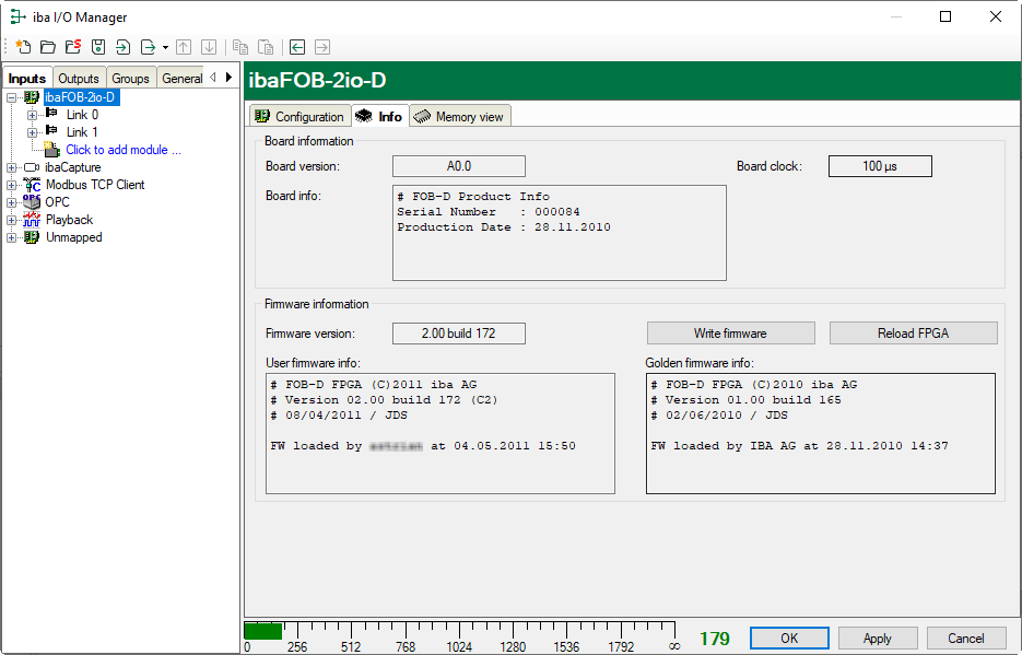 On the Info tab you can see information about the card and the loaded firmware. Functions for service and support, such as reloading the FPGA and updating the firmware are available on this tab.