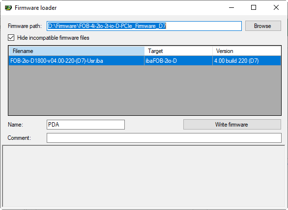The firmware files in the directory are listed in a table. The file name, the associated card and the firmware version are specified. The files can contain the user firmware or the factory “Golden” firmware or both. The "Golden" firmware is only loaded during production.