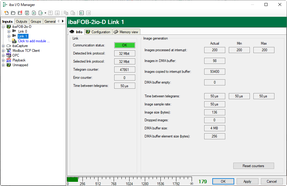 The information on the right side of the dialog describes the image generation (process image). An image is a collection of bytes that the card writes into the PC system memory via DMA. This image contains all data of the measured signals on that link.