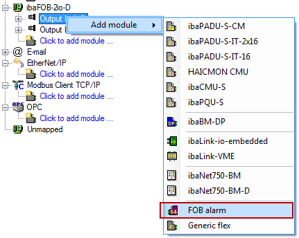 In this mode, only the "ibaNet750-BM" and "FOB alarm" output modules are available for selection. A maximum of 64 analog and 64 digital output signals can be configured for both modules.