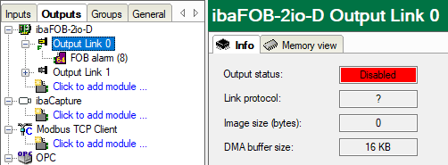 Output links without “FOB alarm” modules or with “FOB alarm” modules assigned but without any signals configured will be marked as disabled in the Info tab.