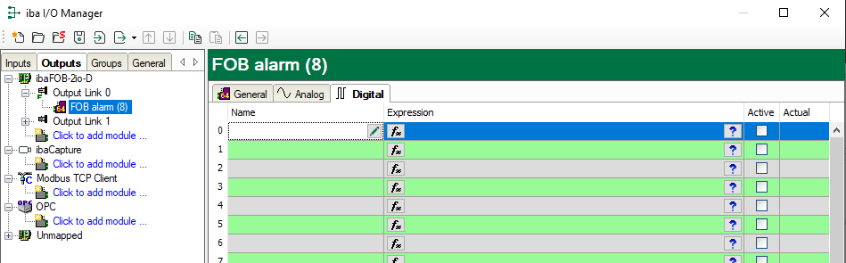 After adding “FOB alarm” modules, you must configure the corresponding output signals (analog or digital) for each module.