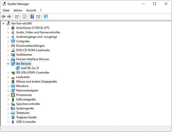 Es muss ein Knoten "iba Devices" und darunter die betreffende Karte (hier "FOB-2io-D") angezeigt werden.