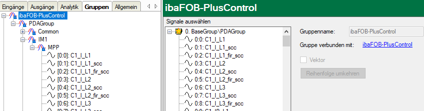 Es wird automatisch für jede ibaFOB-PlusControl-Karte eine Gruppe angelegt. Die Gruppennamen sind vorbesetzt mit den Schnittstellennamen, z. B. "ibaFOB-PlusControl", können aber geändert werden, siehe Kapitel Verbindungsaufbau.