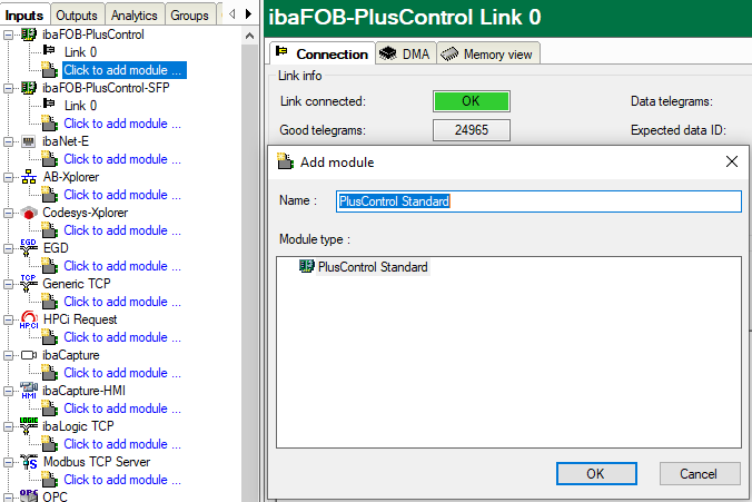 In order to add manually a standard module right-click the link of the ibaFOB-PlusControl card and select PlusControl Standard.