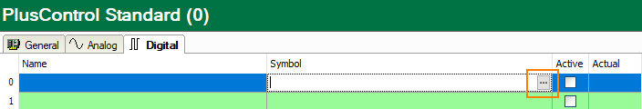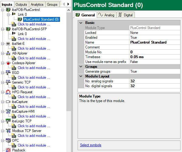 Measurement values for this standard module can be selected using the PlusControl symbol browser. A click on the blue link Select symbols opens the symbol browser.