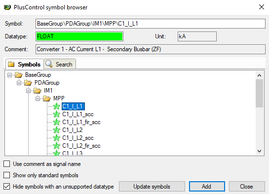 A symbol whose datatype is not supported, will not be displayed. In order to add symbols to the recording, mark the desired symbols and click the <Add> button. The marked symbols will be inserted in the corresponding Analog or Digital tab.
