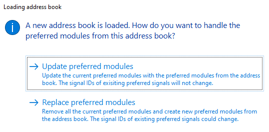 Replace preferred modules: The current preferred modules are removed and replaced by new preferred modules from the address book. The signal IDs of existing preferred signals may change.