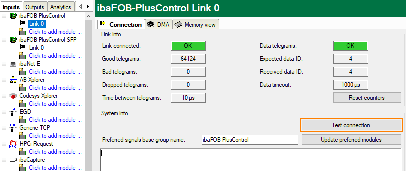 If the card is displayed correctly in the I/O Manager, mark the Link node under the interface. 3 tabs appear on the right side displaying connection information.
