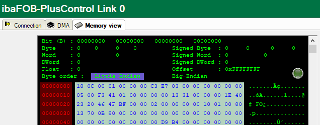 The memory view tab displays the DPR memory on the ibaFOB-PlusControl card.