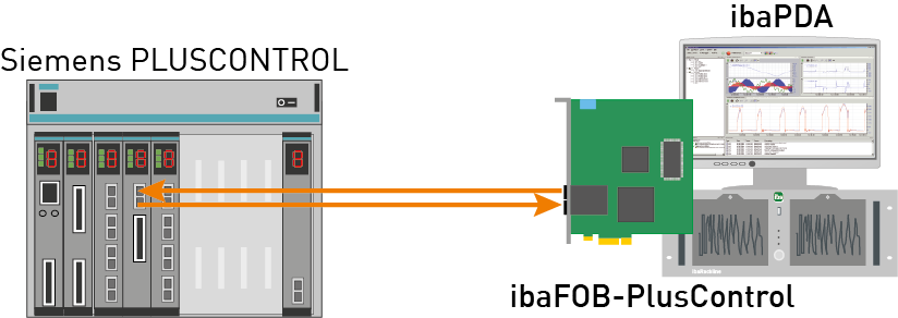 Die PC-Karte ibaFOB-PlusControl dient zur Ankopplung von Siemens PLUSCONTROL-Systemen an das Datenerfassungssystem ibaPDA. Hierzu wird die Karte ibaFOB-PlusControl mit einem PLUSCONTROL CP verbunden.