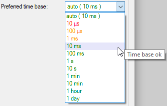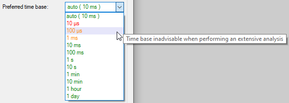 If the set time base is very small and the time range is very large, the amount of data to be loaded may exceed the memory capacity. This means that further processing or analysis of the data is only possible to a limited extent or not at all. ibaHD-Server therefore calculates the amount of data to be expected depending on the set time range and marks the limits in color for the time base values in the drop-down list. If you select Auto as the preferred time base, the optimum time base is selected automatically.