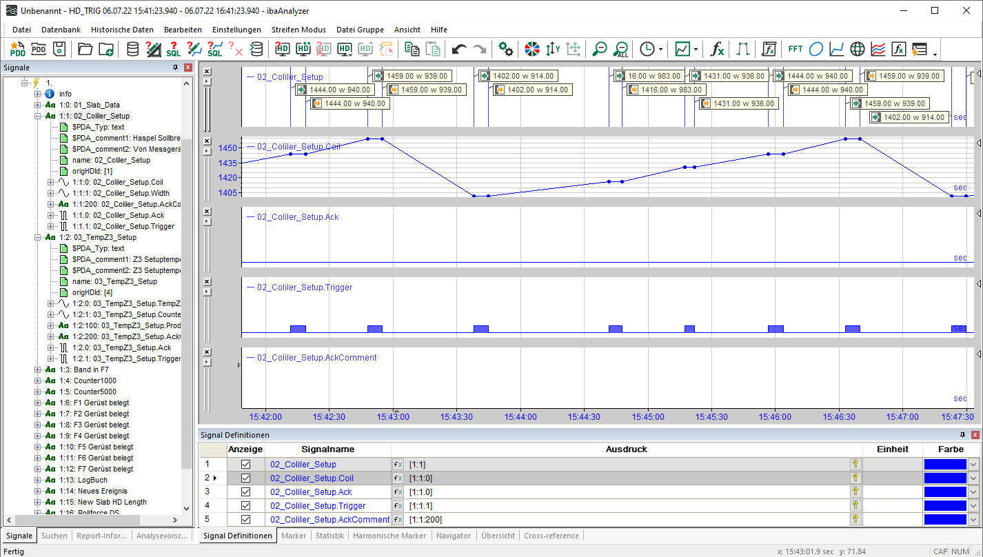 In ibaAnalyzer stehen Ereignisse als Textsignale zur Verfügung. Wenn für das Ereignis numerische Felder definiert sind, stehen diese Ereignisse als analoge, nicht-äquidistante Unterkanäle des Ereignistextsignals zur Verfügung. Ebenso sind alle Textfelder der Ereignisse als Unterkanäle des Ereignistextsignals vorhanden.