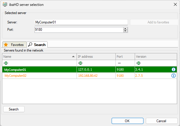 The ibaHD server selection dialog shows a table with the computers detected in the network on which an ibaHD-Server service is running. If required, you can update the table by clicking on <Search>.