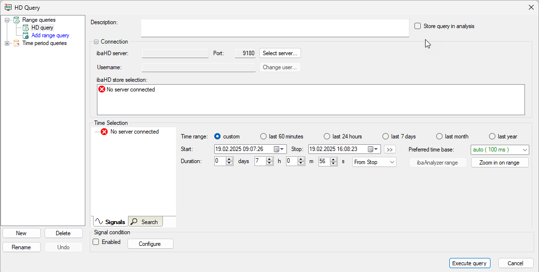 If you are using the HD query function for the first time, you must first establish a connection to the ibaHD-Server and the desired HD storage. You can then configure and execute the query.