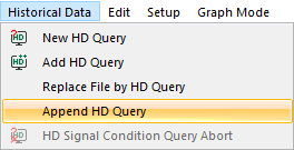 To append a query, select Append HD Query in the Historical Data menu or in the context menu of the signal tree.