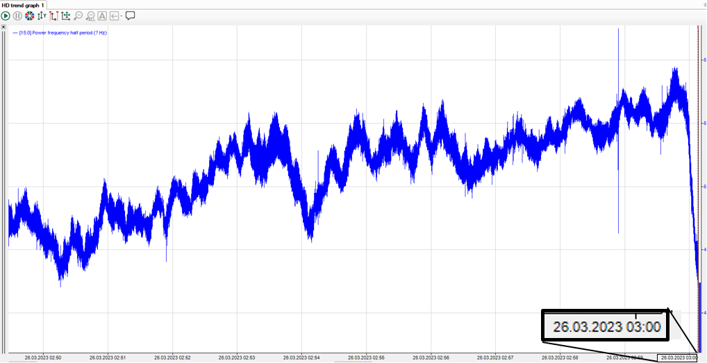 After the change to summer time, i.e. one minute later, the timeline adjusts to the new time and continues the trend retroactively so that there is no gap. The signal trend that was displayed between 1:00 a.m. and 2:00 a.m. on winter time now corresponds to the time period from 2:00 a.m. to 3:00 a.m. on summer time: