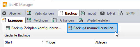 Wählen Sie im ibaHD Manager im Register Backup – Folgeregister Erzeugen den Button <Backups manuell erstellen…>.