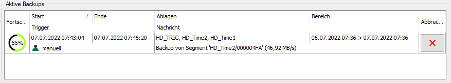 Der Fortschritt des Backups wird im Register Erzeugen im Bereich Aktive Backups angezeigt.