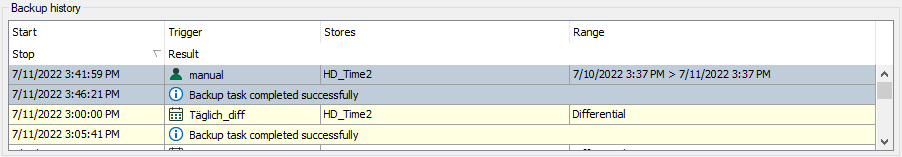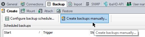 In the ibaHD Manager, select Backup tab – follow-up tab Create, menu button <Create backups manually...>.