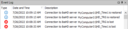 ibaPDA periodically tries to restore an interrupted connection to the ibaHD-Server. When a connection of an HD data store has been interrupted or restored, this will be compiled in the event log of the ibaPDA.
