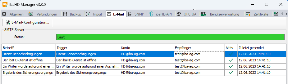 Mit Hilfe der E-Mail-Funktion kann ibaHD-Server E-Mails an definierte Empfänger senden, beispielsweise um Statusänderungen mitzuteilen. Das Versenden der E-Mails wird durch verschiedene, vordefinierte Ereignisse bzw. Statusänderungen ausgelöst. Wenn Sie den Button <E-Mail-Konfiguration> klicken, haben Sie folgende Möglichkeiten: