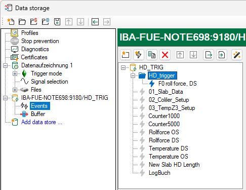All triggers which are configured in the module generate an event in the selected HD event store when firing. Definition of the trigger in the I/O Manager in ibaPDA: