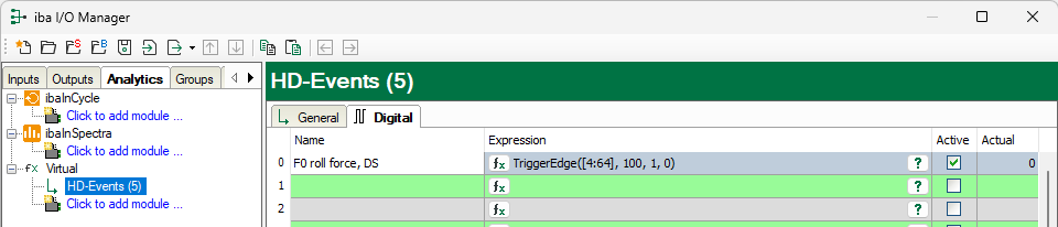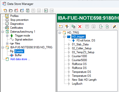 All triggers which are configured in the module generate an event in the selected HD event store when firing. Definition of the trigger in the I/O Manager in ibaPDA: