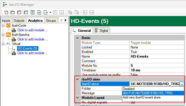 When configuring trigger modules in the ibaPDA I/O Manager, you can define in the module settings in which HD event store the trigger firings are written as events.