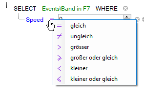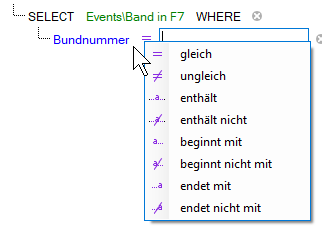 Abhängig vom ausgewählten Feld (Zahlen- oder Textfeld) wird bei Klick auf das lila farbene Gleichheitszeichen eine Liste von Operatoren angezeigt. Wählen Sie den erforderlichen Operator aus.