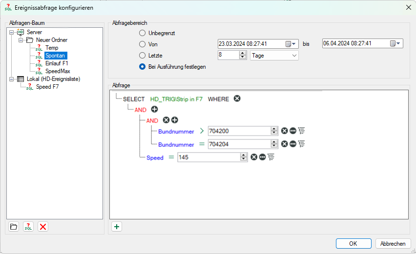 Letzte xx Minuten/Stunden/Tage/Wochen/Monate: Die Abfrage erstreckt sich nur auf einen fest vorgegebenen Zeitraum ab Start der Abfrage, z. B. die letzten 8 Stunden für einen Schicht-Überblick.