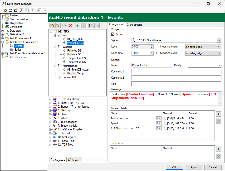 Configuration In this tab, you configure the events, i.e. the name, the firing trigger signal and the message text.