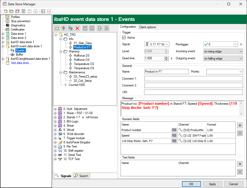Configuration In this tab, you configure the events, i.e. the name, the firing trigger signal and the message text.