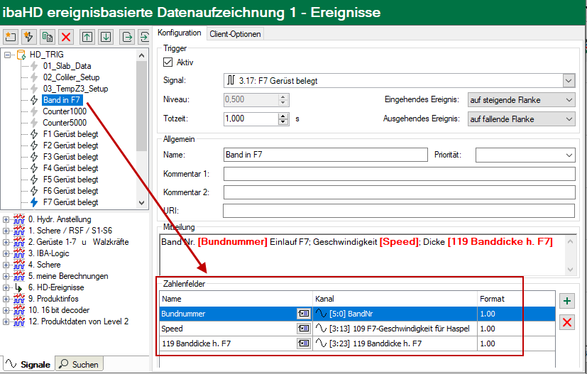 Dem Ereignis "Band in F7" sind drei Zahlenfelder zugewiesen.