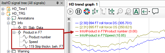 You can drag the numeric fields with (dynamic) signal values or text fields with text signals which are configured in the event into the HD trend graph for display. If you do so, the actual values at the time of event occurrence are displayed.