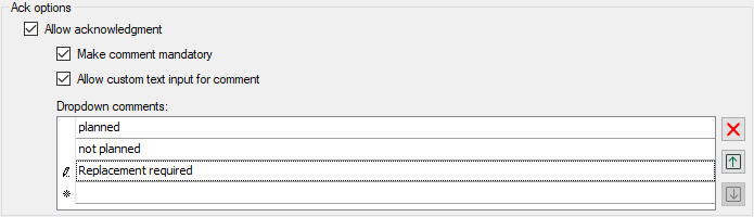 In this list, you can enter acknowledgment comments that are then available to choose from in the drop-down list during acknowledgment. Use the arrow symbols to the right of the list to change the sequence of the comments. Use the delete icon to remove the comment in which the cursor is located.
