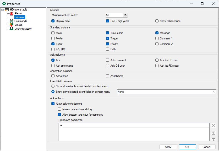 Here you can select which columns should be shown in the event table and which should not. In addition to the standard columns, you can enable or disable special columns for acknowledgment and notes.