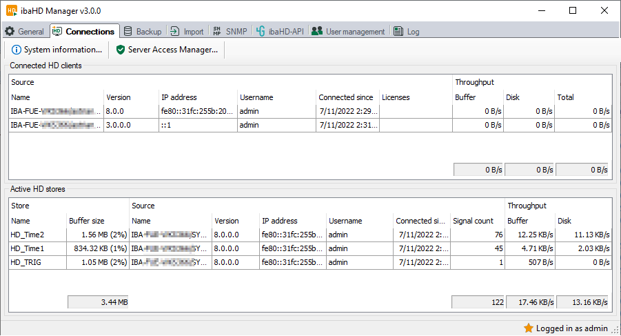 The current connection parameters of the active HD client (with version no., IP address and user name) and the active HD stores are displayed in the Connections tab in the main window of ibaHD Manager.