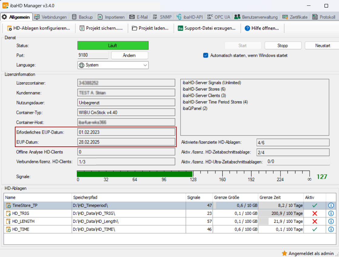 Im Register Allgemein des ibaHD-Manager finden Sie Informationen zum Dienst, Lizenzinformationen und zu den existierenden HD-Ablagen.