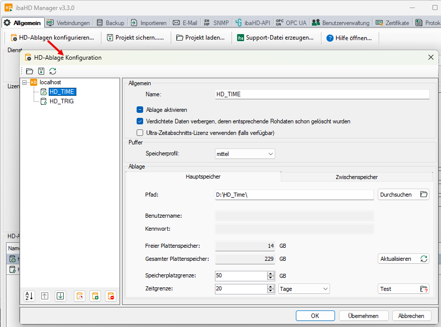 Mit Klick auf <HD-Ablagen konfigurieren…> öffnet sich der Konfigurationsdialog für die Ablagen des ibaHD-Servers. Den gleichen Dialog erhalten Sie, wenn Sie in der Datenaufzeichnungskonfiguration von ibaPDA auf den Button <Konfigurieren> klicken.