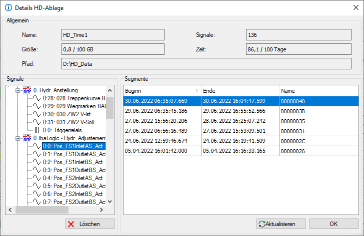 Hier werden die angelegten HD-Ablagen mit den zugewiesenen Signalen angezeigt. Pro Signal werden die vorhandenen Daten aufgelistet. Dabei entspricht eine Zeile einem Datensegment in der ibaHD-Server Datenbank.