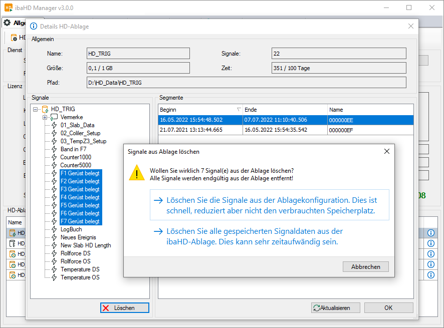 Es ist jedoch auch möglich, die Signale zu löschen, indem man das Signal aus dem Index entfernt. Dann kann nicht mehr auf das Signal zugegriffen werden, aber die Daten sind noch in den Segmenten vorhanden. Dieser Vorgang geht schnell, reduziert jedoch nicht den verbrauchten Speicherplatz. Der belegte Speicherplatz wird erst dann reduziert, wenn die Daten durch eine Aufräum-Strategie aus den Segmenten entfernt werden.