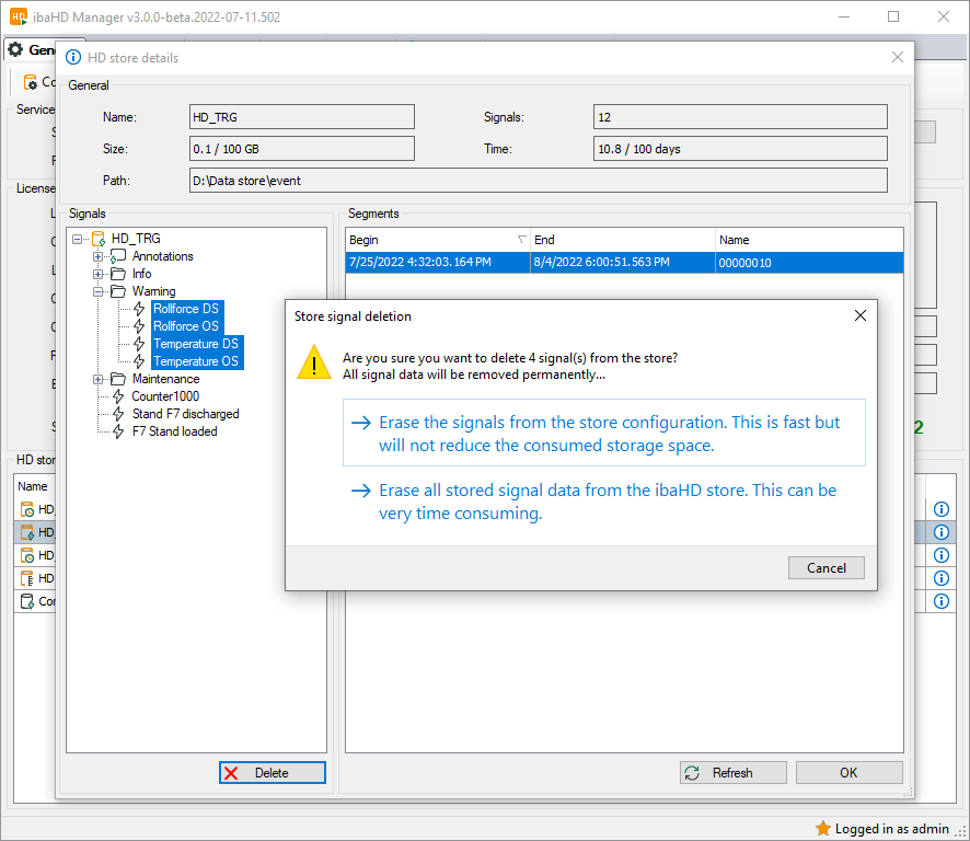 However, it is also possible to delete the signals by removing the signal from the index. Then the signal can no longer be accessed, but the data is still present in the segments. This operation is fast, but does not reduce the used disk space. The used disc space is not reduced until the data is removed from the segments by a cleanup strategy.