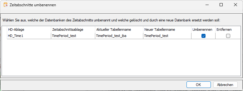 Wenn Sie den Tabellennamen nachträglich ändern, müssen Sie die Referenzen auf die Tabellen aktualisieren. Beim Anwenden der geänderten Konfiguration erscheint ein Dialog, in dem alle Tabellen mit dem alten und neuen Tabellennamen aufgelistet werden, sowie Informationen zur zugehörigen HD-Ablage und Zeitabschnittsablage.